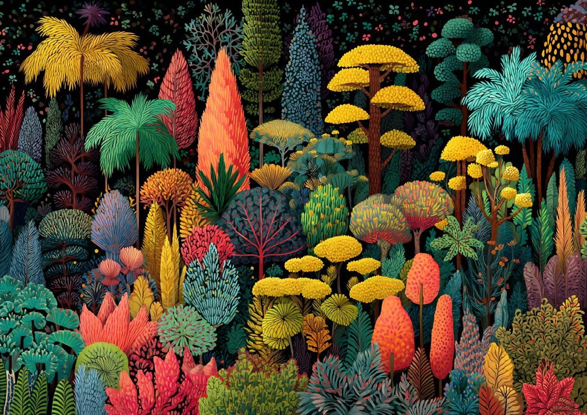 Создано на основе запроса: surreal colourful exotic jungle interior, inspired by Kusama and Matisse and Derain and Miro and Mary Blair, dark