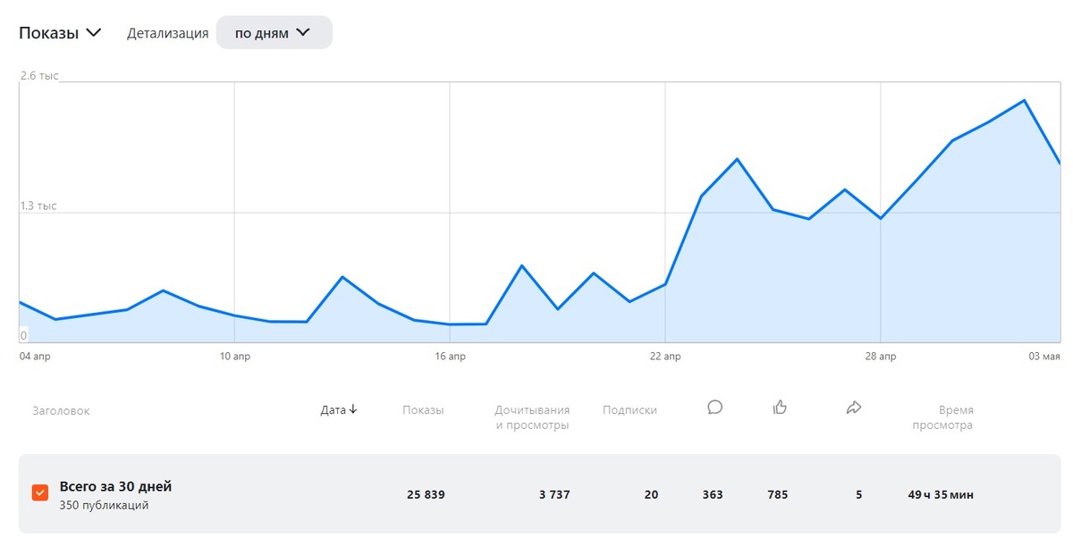 Можно на это сказать: "Ну, конечно, ты ведь стала писать гораздо больше статей". Но меня-то интересует количество показов на одну статью. И этот показатель растет. Вот здесь я считала количество показов на статью сейчас и раньше: И выходило, что сейчас (то есть тогда, три дня назад) Дзен выдавал мне в среднем 58 показов на одну статью. А сегодня? 25839 показов на 350 статей. В среднем это уже 73 показа на статью. Буду и дальше пробовать растить это показатель, чтобы было больше дочитываний и, соответственно, рос доход. Не знаю, можно ли сейчас вернуться к прежним показателям, когда количество показов на статью исчислялось тысячами, но почему бы не попробовать? У меня появился азарт в этом вопросе. А на сколько его хватит, будет зависеть в том числе и от результатов, к которым приведут принятые мною меры. Вообще, Дзен уже, конечно, не тот, что раньше. Мне кажется, раньше за минуту просмотра материалов выходило несколько рублей дохода. А сейчас... Вот тут я подсчитала этот показ