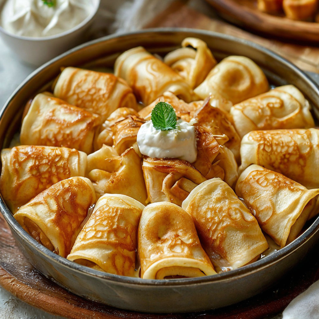 Сегодня готовим восхитительные блины, запеченные в сметане, – идеальное блюдо для уютного завтрака или десерта! Начнем с приготовления блинного теста. В глубокой миске смешиваем 110-120 г пшеничной муки с 0,5 ч. л. разрыхлителя и щепоткой соли. В отдельной посуде взбиваем 1 яйцо с 1 ст. л. сахара, добавляем 150 г молока и 150 г воды, тщательно перемешиваем. Жидкую смесь постепенно вливаем в муку, помешивая, чтобы не образовались комки. В конце добавляем 1 ст. л. растительного масла и перемешиваем до однородности. Сковороду смазываем растительным маслом и выпекаем тонкие блины с обеих сторон до золотистого цвета. Готовые блины складываем стопкой. В отдельной миске смешиваем 150-180 г сметаны с сахаром по вкусу. Блины сворачиваем трубочками или конвертиками и плотно укладываем в форму для запекания. Заливаем блины сметанной заливкой и ставим в разогретую до 180 градусов духовку на 15-20 минут, пока сметана не подрумянится. Даём немного остыть и подаём к столу. Наслаждайтесь нежным вкусом
