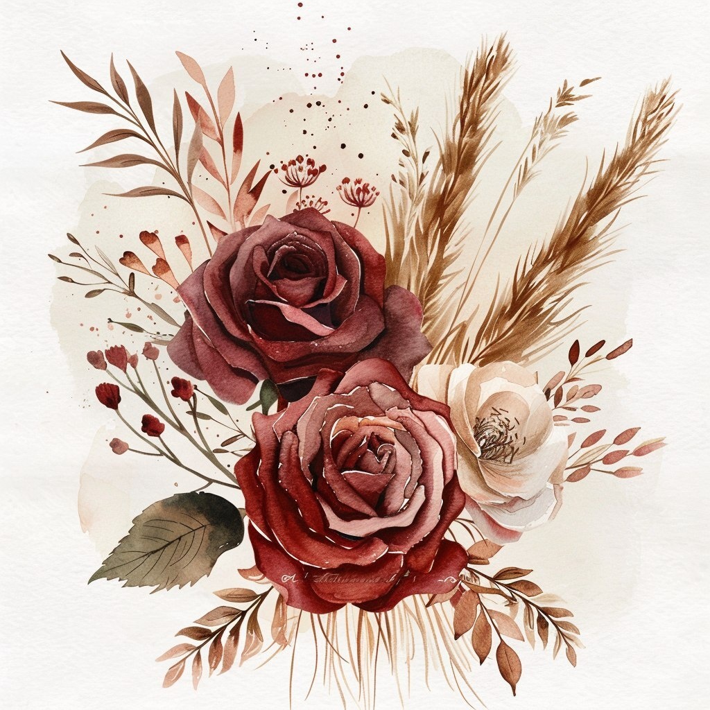 Создано на основе запроса: autumn rose watercolor bouquet, boho rose, pampas grass, fall flowers, burgundy watercolor roses on white texture