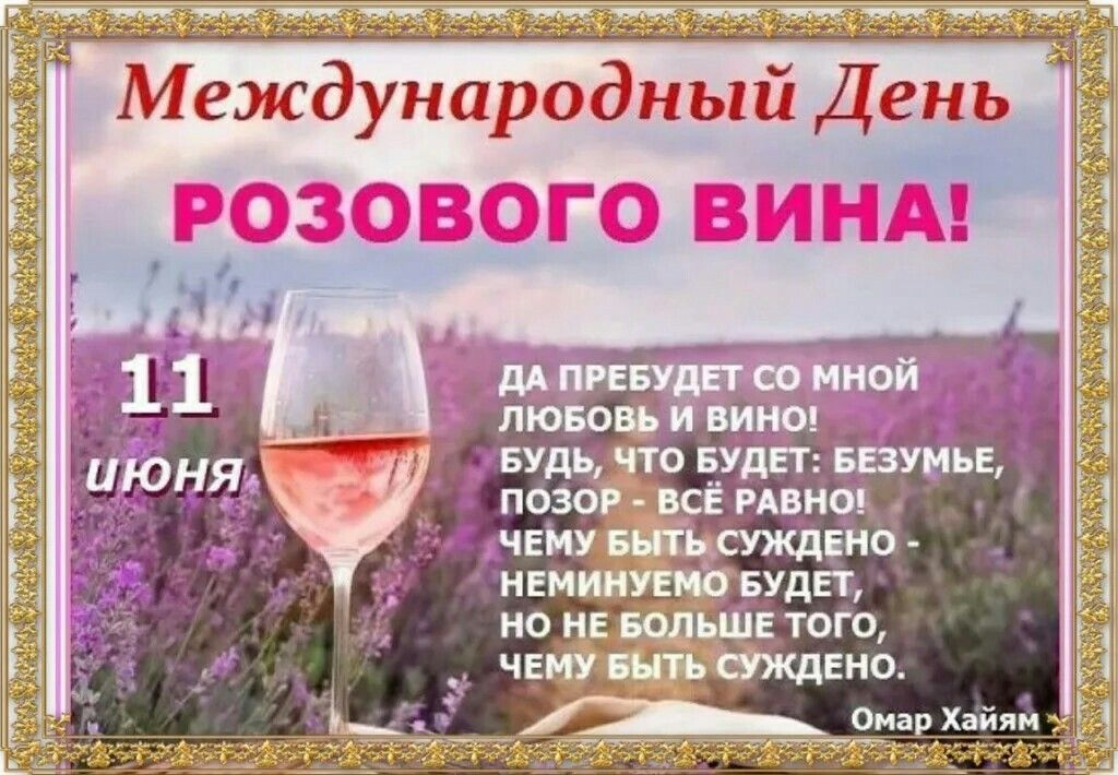 Международный день розового вина (International Rosé Wine Day) отмечается 11 июня в некоторых странах, особенно в тех, где популярно виноделие, таких как Франция, Италия и США. Этот день посвящён лёгкому и освежающему розовому вину, которое идеально подходит для летнего сезона. В 2025 году винодельни, рестораны и бары организуют дегустации, фестивали и мастер-классы, посвящённые истории и производству этого напитка.