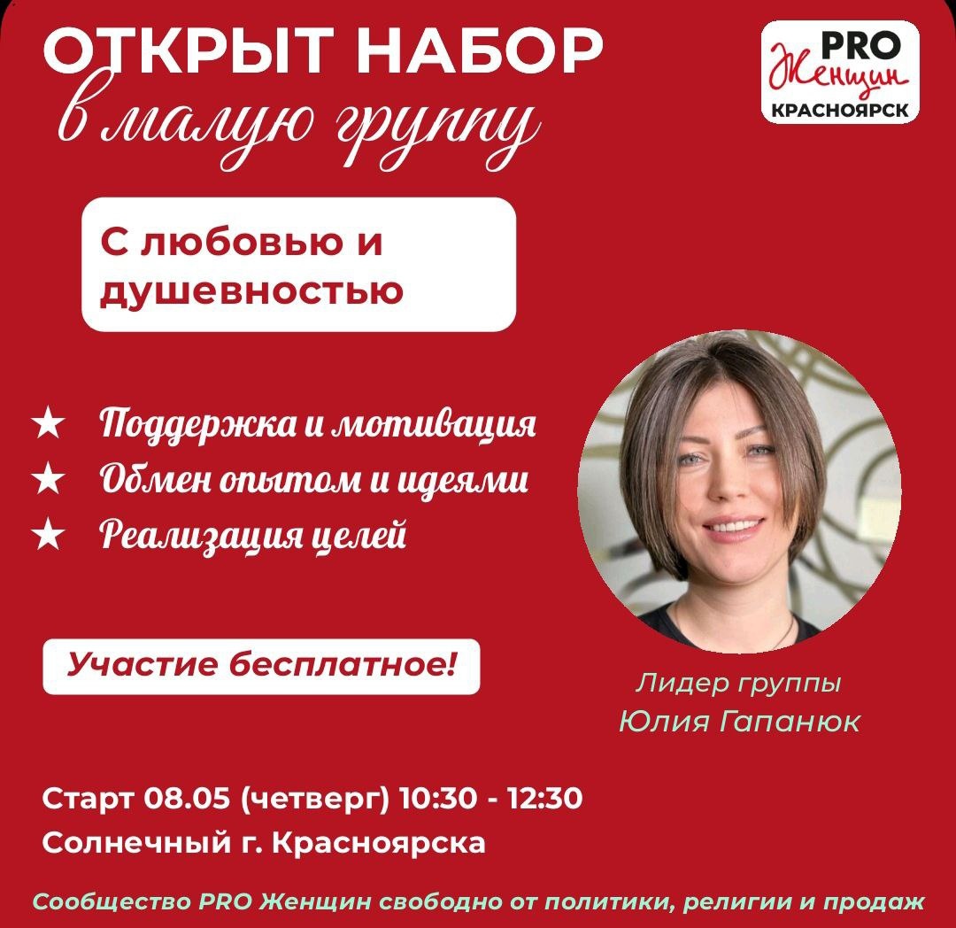 🔔 ОТКРЫТ НАБОР В ГРУППУ "С ЛЮБОВЬЮ И ДУШЕВНОСТЬЮ" ❤️ Участие безоплатное! Лидер сообщества PRO Женщин Юлия Гапанюк объявляет набор в группу поддержки для простых женщин (не бизнес вумен) Слово Юлии: "Любовь и душевность" — это состояние женщины: ❤️ через сердце ❤️ через делание без ожидания ❤️ ресурс великой мудрости и сил, чтобы не происходило ❤️ давать тепло души одновременно наполняя этим себя ❤️ получать удовольствие от простых человеческих отношений «На наших встречах вы сможете: ◽️ Обрести поддержку и вдохновение 😘 за чашечкой чая, кофе ◽️ Обсудить важные вопросы для достижения своих целей по-женски, с лёгкостью ◽️ Получить полезные рекомендации, инсайты и мотивацию ◽️ Познакомиться с замечательными женщинами, стремящимися к личностному росту и развитию В нашей группе: ◽️ Комфортная атмосфера для каждой участницы, без терапии или психологической работы ◽️ Каждая участница поставит свою личную цель и будет двигаться к ней при поддержке группы ◽️ Мы будем делиться своим лич