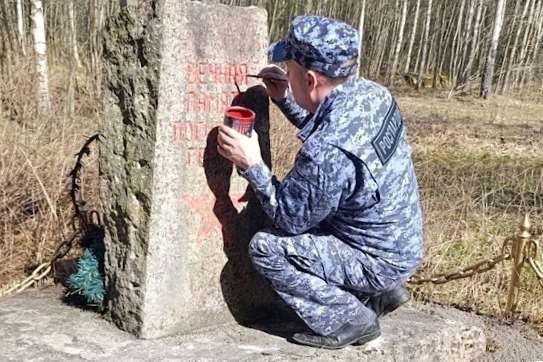 В преддверии Дня Победы в Великой Отечественной войне сотрудники, работники и стажеры отдела вневедомственной охраны по Приозерскому району Ленинградской области посетили воинское захоронение, расположенное в поселке Починок, где провели работы по благоустройству территории. Участники акции очистили памятник, собрали сухую траву и листья, а также восстановили надпись: «Вечная память погибшим героям». После завершения работ сотрудники почтили память защитников Отечества минутой молчания и возложили к мемориалу цветы.