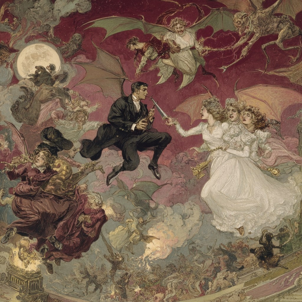Создано на основе запроса: demons escaping Tartarus, in the style of belle epoque
