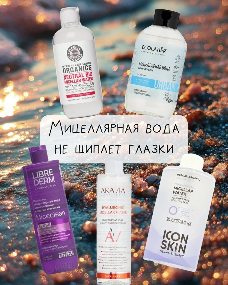 Сохраняйте подборку мицеллярной воды, если у вас чувствительная кожа, а макияж всё равно нужно смывать подчистую Вот список проверенных банок, которые не жгут глаза, не сушат и не оставляют липкости, но при этом реально работают: 1. Icon Skin — гиалуронка, пантенол, алоэ, бетаин. Очень мягкая, но мейк снимает отлично 2. Planeta Organica Pure — натуральный состав, без агрессии, без отдушек 3. Aravia — с гиалуроновой кислотой. Лучшая находка для снятия плотного макияжа 4. Ecolatier — с кактусом и алоэ. Если кожа склонна к раздражению, точно спасёт 5. Librederm с пребиотиками — заботится о микробиоме, ощущается как заботливое облачко Всё мягкое, но эффективное — никакой лишней агрессии. Признаюсь, моя самая сильная не любовь к мицелярки Garnier и Чистая линия. Одна всё смывает, но щипит адски, другая не смывает