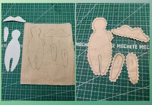 Продолжаю украшать мой творческий блокнот. На обложке решила разместить куколку Фею. Куколку можно размещать не только на блокнотах и альбомах, она может быть брошкой, брелком и просто интерьерной куколкой. Для пошива понадобится бязь телесного цвета, если нет таковой, то можно белую ткань тонировать кофе или чаем. Ткань складываем вдвое, выкройку располагаем по долевой, не вырезая, прошиваем на машинке либо вручную. Вырезаем. Если нет ножниц зигзаг, то делаем надсечки. Крылышки и ручки прошиваем, не оставляя отверстий. Для выворачивания в этих деталях делаем надрезы. Наполняем детали наполнителем (у меня лебяжий пух). Стараемся, чтобы игрушка при наполнении была плоской. Ручки я не наполняла, но можно немного наполнить, придав им объема. Для платья необходимо выбрать ткани х/б и любое подходящее кружево. Дополнительно я выбрала тесьму с вышивкой. Сшиваем кусочек ткани постельным швом и стягиваем вверху на куколке. Украшаем платье. Я пришила кружево из сетки и сделала небольшую брошку