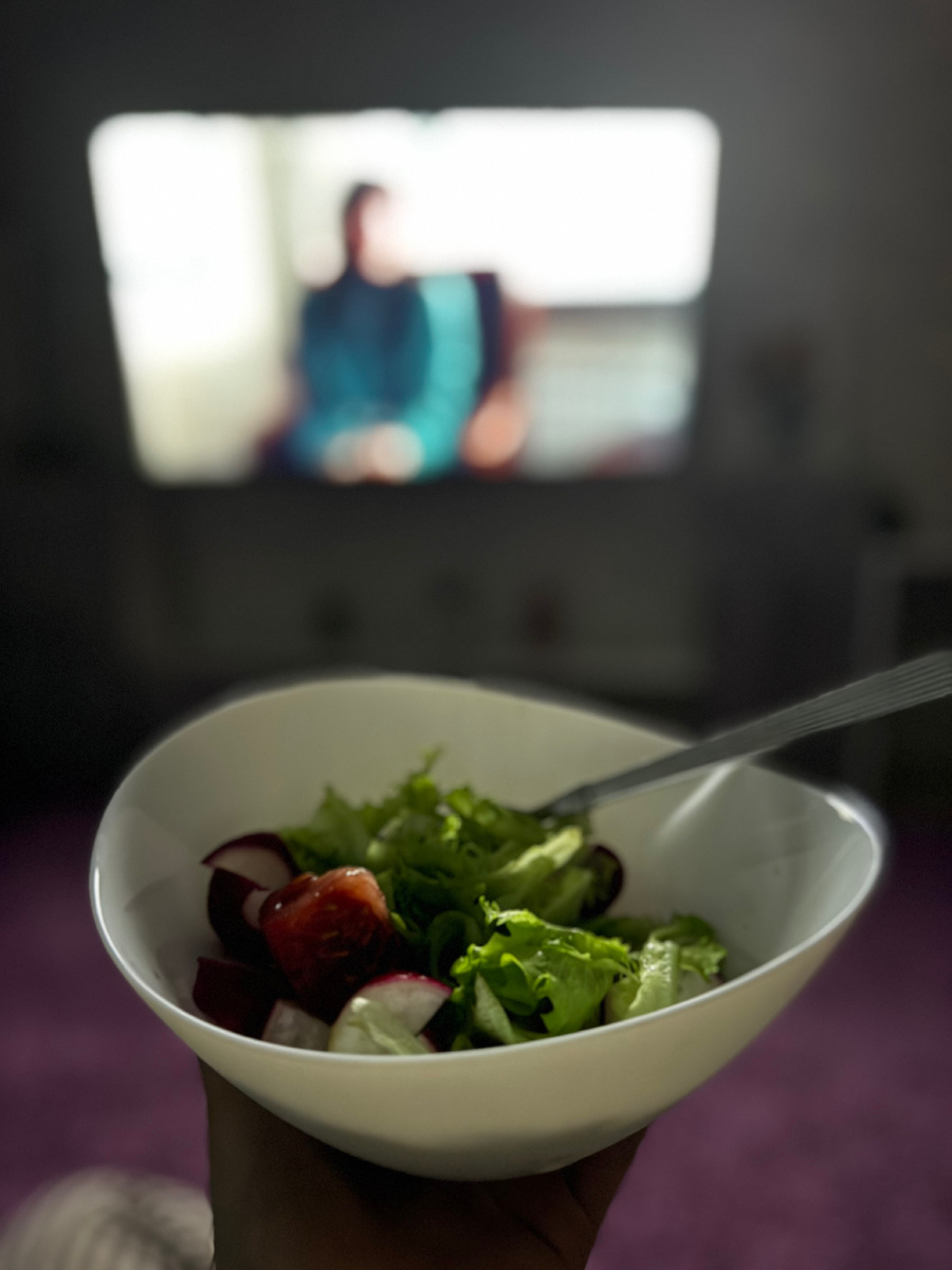 Второй приём пищи за день — салат без масла. Аппетит стал умереннее, уже два дня не срываюсь. Уборка дома помогает отвлечься от мыслей о еде. Сегодня я вымыла всю квартиру до блеска. Сейчас наслаждаюсь сериалом, ем салат и радуюсь своим достижениям. Объёмы в талии начали уменьшаться, живот подтягивается. Это результат регулярных усилий: делаю баночный массаж через день и медовый массаж каждый день. Вижу, как жир уходит, и это вдохновляет. Я пробовала разные виды массажа в салоне, но поняла, что домашний уход более эффективен и экономичен. Главное — не лениться и регулярно заниматься собой.