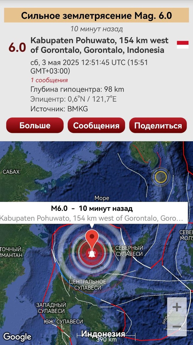 В ответ на пост Согласно предупреждению от 29 апреля картина к востоку от Сулавеси привела к землетрясению М6.0 в северной части острова === According to an April 29 warning, the pattern east of Sulawesi led to an M6.0 earthquake in the northern part of the island.