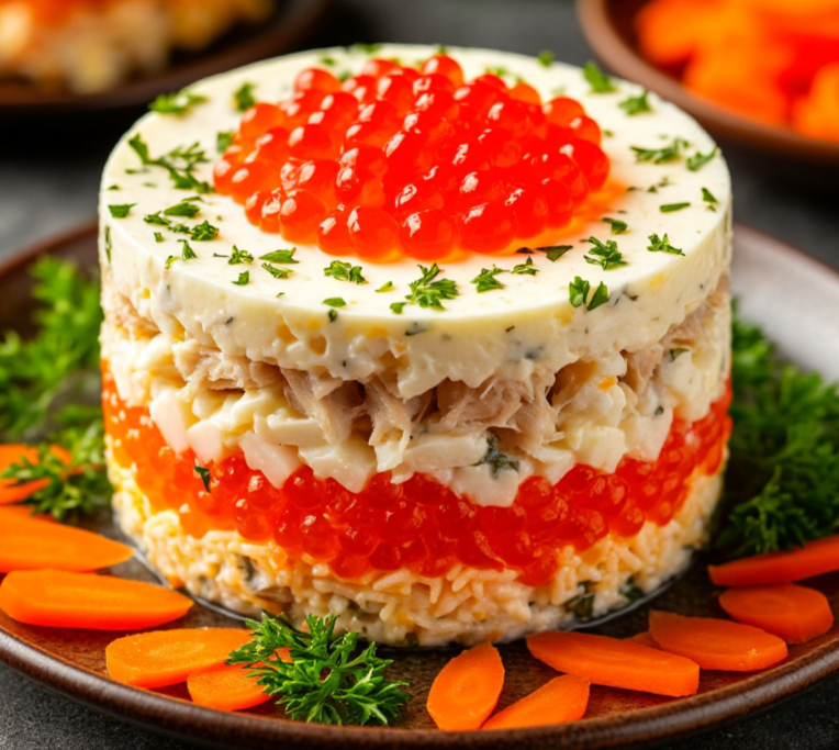 Сегодня мы приготовим необычный и вкусный салат, который отлично подойдет для праздничного стола! Начинаем с подготовки ингредиентов: 250 г отварного картофеля и 300 г отварной моркови очищаем и натираем на крупной терке. 4-5 отварных яиц очищаем и также натираем на крупной терке. 140 г плавленого сырка натираем на мелкой терке. 240 г рыбных консервов (без жидкости и масла) разминаем вилкой. 1 луковицу мелко нарезаем. Берем форму высотой 8 см и диаметром 17 см. Выкладываем салат слоями, промазывая каждый слой майонезом (100 г майонеза по вкусу). Первый слой – тертый картофель, затем рыбные консервы, мелко нарезанный лук, тертый плавленый сырок, икра мойвы (180 г), тертые яйца и тертую морковь. Каждый слой немного присаливаем по вкусу. Верхний слой смазываем майонезом и украшаем красной икрой и зеленью по желанию. Даем салату настояться в холодильнике несколько часов, чтобы он хорошо пропитался. Перед подачей аккуратно снимаем форму. Наш необычный салат готов! Наслаждайтесь его нежным в