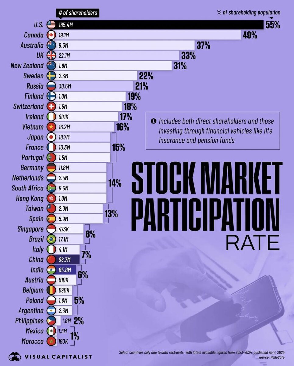 ❓Почему американцы массово инвестируют в акции? В США больше половины населения (55%) так или иначе участвует в фондовом рынке. Через брокеров, пенсионные фонды или страховки — неважно. Факт в том, что для них инвестировать — это нормально. 🔹 В Канаде — 49%, в Австралии — 37%, в UK — 33%. 🔹 В России — 21%. Уже не так плохо, но всё ещё отстаём. 🔹 В Китае — 7%, в Индии — 6%. Вывод? В странах, где инвестирование — это норма, выше финансовая грамотность, ниже зависимость от государства и больше личной свободы. А теперь внимание: с начала 2025 года рынок акций в США упал на -15%. И представьте, как это ощущается, когда каждая вторая семья — акционер. Но именно из-за этого они: — регулярно откладывают, — не паникуют на просадках, — покупают на автомате (через ETF и пенсии). Это и есть настоящая стратегия — не угадывать, а регулярно участвовать.