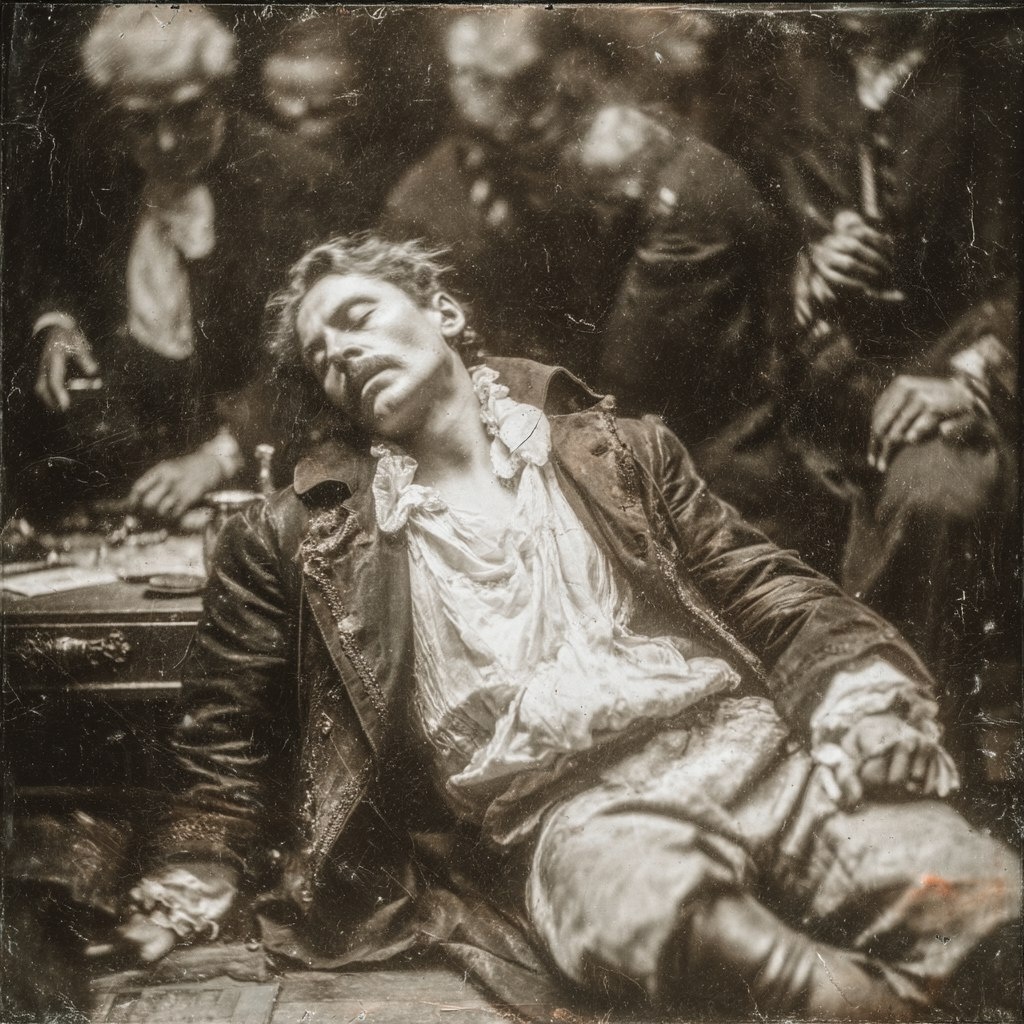 Создано на основе запроса: a man laying on the floor / in front of a crowd / in the style of chiaroscuro dramas / elaborate gothic costumes