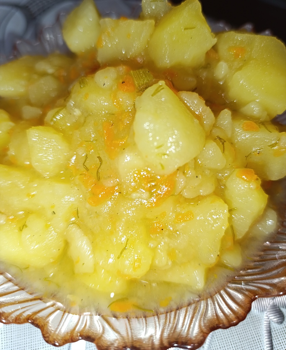 Для приготовления тушеного картофеля подойдет любой картофель, кроме раннего. В раннем картофеле мало крахмала и картофель не будет таким разваристым. Итак, картофель очищаем, моем и крупно нарезаем. Заливаем водой так, чтобы вода не доходила до уровня картофеля сантиметра 2. Как только картофель закипит, солим, добавляем тертую морковь, измельченный чеснок и 0,25 ч л молотого перца. Накрываем крышкой и тушим, изредка помешивая. Сам картофель уже будет готов через 25 минут, но мы готовим, пока не выпарится нужное Вам количество жидкости. Вы можете приготовить густой тушеный картофель (почти полное выпаривание жидкости), можно приготовить картофель и с большим количеством жидкости. Это на Ваше усмотрение. За 7-10 минут до конца готовки добавляем измельченную зелень. Если хотите удивить своих домашних вкусом и цветом тушеного картофеля, то при готовке добавьте 0,25 ч л куркумы. Приятного аппетита!!!!