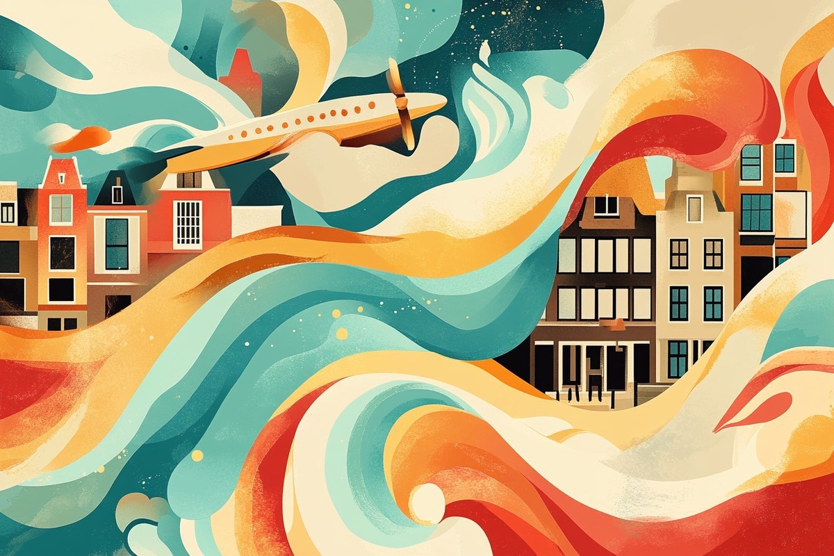 Создано на основе запроса: A beer label design with abstract swirls and freeform shapes inspired by beer foam and Dutch tulip fields. Use bold, expressive color splashes based on the Zoom concept palette: warm coral, teal, soft blue, and muted yellow. Include a stylized airplane subtly integrated into the abstract flow, and minimalist silhouettes of Dutch canal houses blending into the background. Modern sans-serif typography. Flat vector or painterly style, expressive and contemporary, --- Автоперевод: Дизайн пивного лейбла с абстрактными вихрями и формами свободных форм, вдохновленными пивными пенами и голландскими полями тюльпанов. Классно выглядит? 🤔 https://dzen.ru/id/65c0c65c86e4f837c27b24d7 #ИИ #AI #нейросеть #midjourney #art