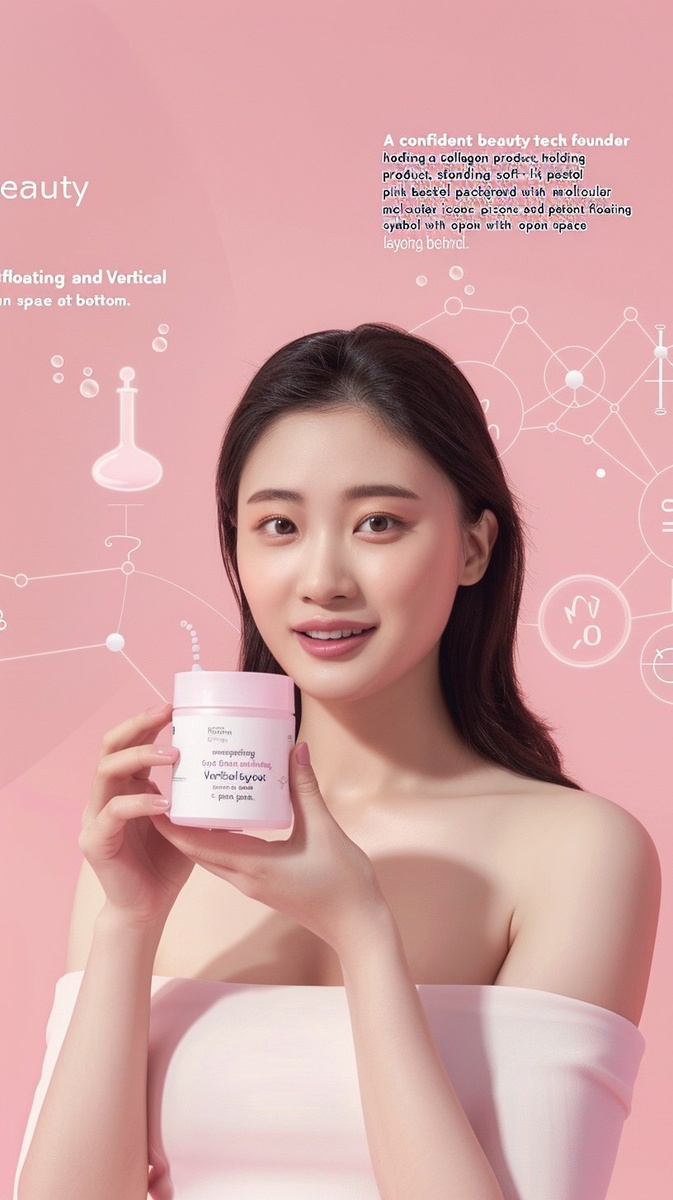 Создано на основе запроса: "A confident Korean beauty tech founder holding a collagen product, standing in a soft-lit pastel pink background