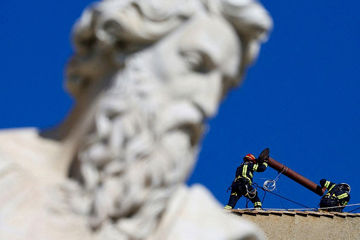 Фотографии, опубликованные агентствами Reuters и Vatican Media, фиксируют момент установки специальной трубы на крышу капеллы — технически это один из