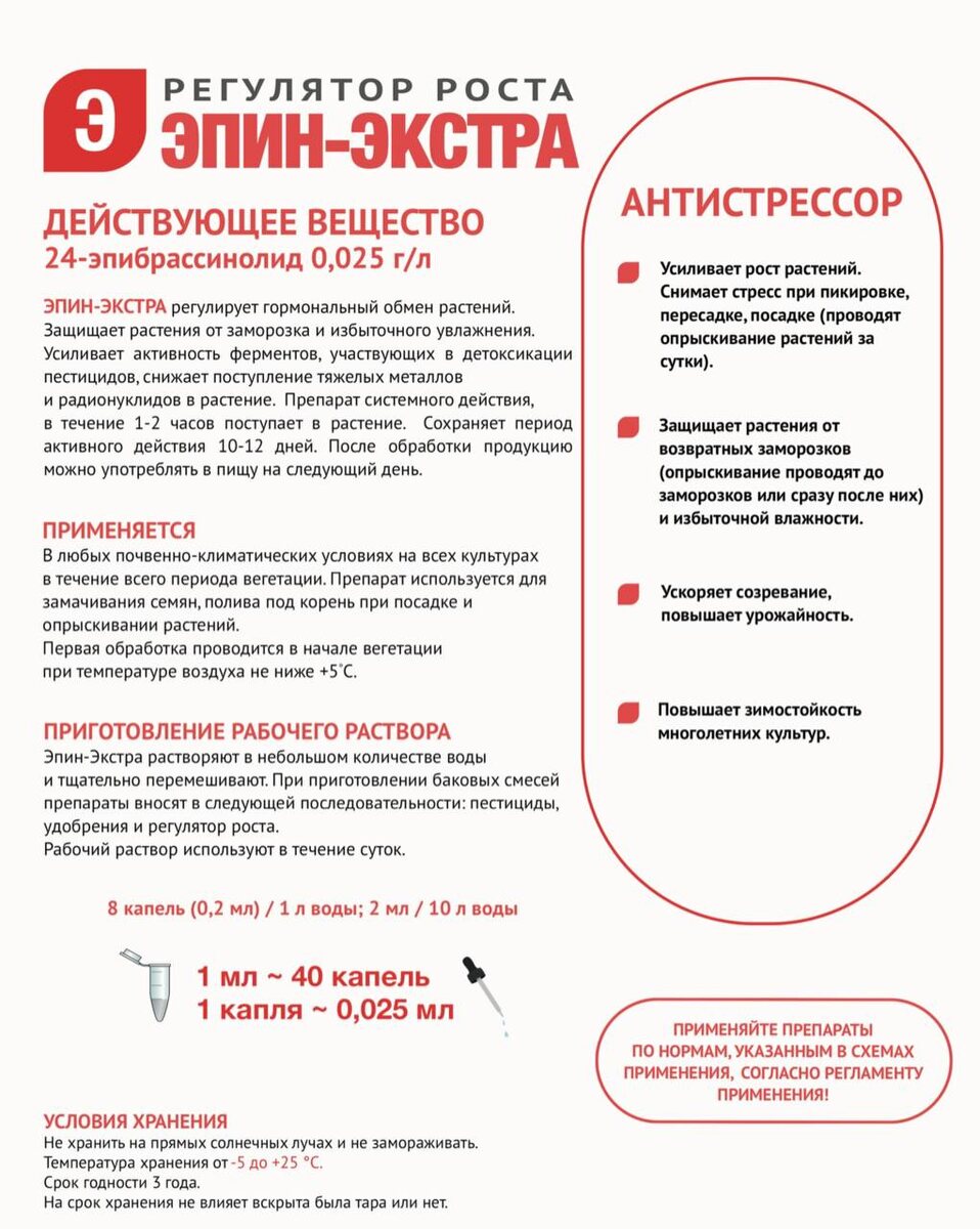 👀📌МИФЫ И ФАКТЫ Немного пространно-логических рассуждений про Эпин и Циркон. Сейчас на каждом втором (даже на первом) ресурсе пишут о том, что Эпин (да и Циркон, что уж там😁) распадается на солнце. Ни в одном официальном химическом справочнике я такой информации не нашла. А вот то, что температура плавления действующего вещества Эпин (эпибрассинолид) составляет 256°С — это да, точно. ✅С сайта производителя НЭСТ М от 8.04.25 (аналогично и Циркон) Порядок приготовления рабочего раствора: Рабочий раствор готовят непосредственно перед обработкой. Бак опрыскивателя или протравителя заполнить на 1/3 водой, добавить необходимое количество препарата, предварительно разведенного в воде. Долить воду до необходимого объема, раствор перемешать и производить обработку. Опрыскивать растения утром или вечером в сухую, безветренную погоду, равномерно смачивая листья. Рабочий раствор использовать в день приготовления. Скорость воздействия – сразу после обработки. Неужели вы думаете, что производ