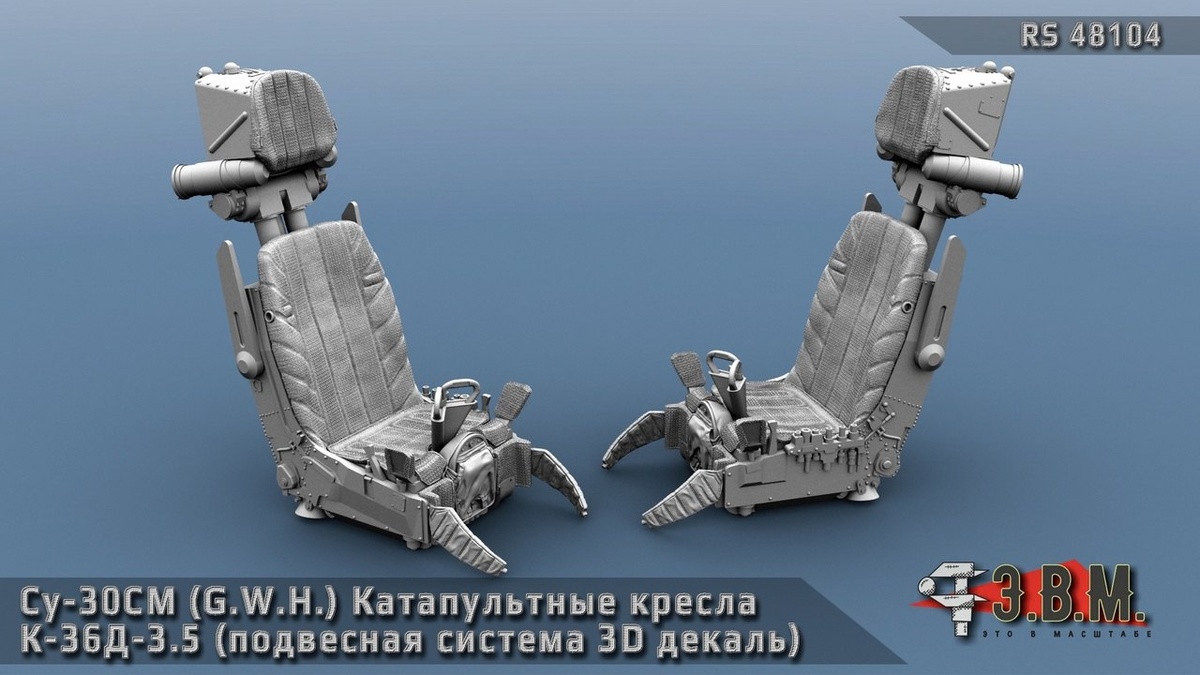 Э.В.М. из Севастополя выпускает смоляные катапультные кресла К-36Д-3,5 для модели Су-30СМ в масштабе 1/48 от GWH с подвесными системами в виде "трехмерной декали" от Emboss.