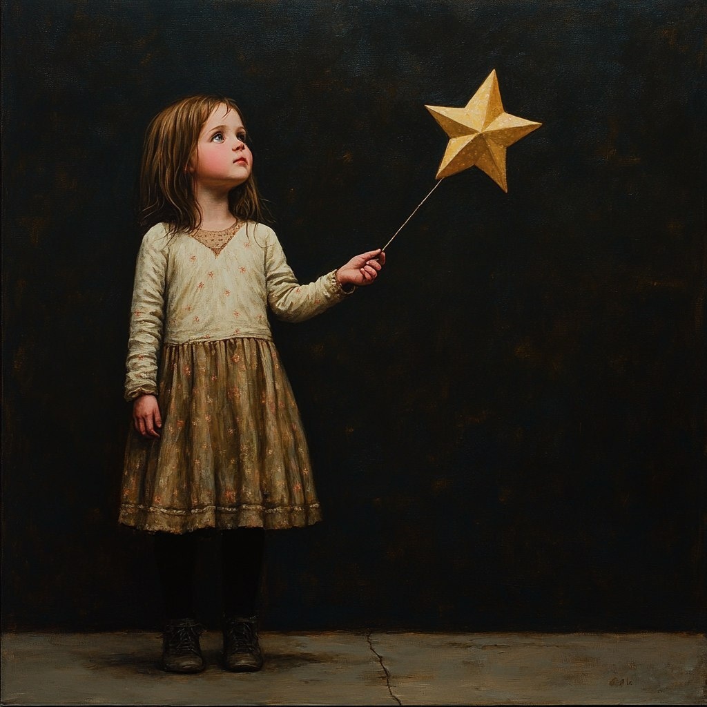 Создано на основе запроса: little girl holding a string with a star instead of a balloon. Large scale, realistic/ illustrative style. --- Автоперевод: Маленькая девочка держит струну со звездой, а не с воздушным шаром. Неплохо получилось? 🤔 https://dzen.ru/id/65c0c65c86e4f837c27b24d7 #ИИ #AI #нейросеть #midjourney #art