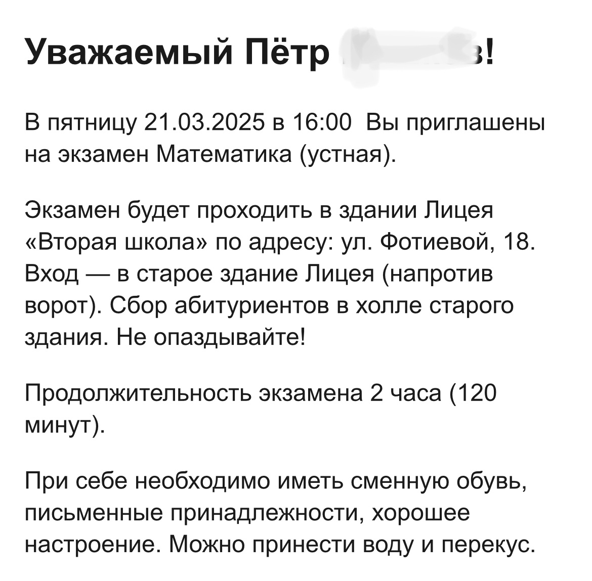 Продолжаем историю, как мы поступили в знаменитую физ -мат школу Л2Ш второй этап был без выбора даты и мы не стали отказываться о предложенного варианта ( знаю, что можно перенести любой этап по уважительной причине) И вот снова без подготовки, снова не открывали и не смотрели примерные варианты отправила ребенка на устную математику Перед входом в школу сказала ребенку - "ты справишься". Да, я уверенна, что если мой сын серьезно отнесется, то сможет решить и сдать устно математику без труда. Но забыла сказать - "решай по максиму" Почему необходимо решить максимальное количество задач, и не останавливаться на 5-ой задачи? Перед началом экзамена неизвестно сколько решенных задач будут являться проходными. Например, за неделю до нашей даты проходной бал был 5 задач, а когда сдавал мой сын было 6 задач, после нам рассказывали, что можно было решить 4 задачи и получить зачет... Обязательно скажите ребенку, чтобы он решал максимально все задачи не знаю как в приемной 6-7 класса,