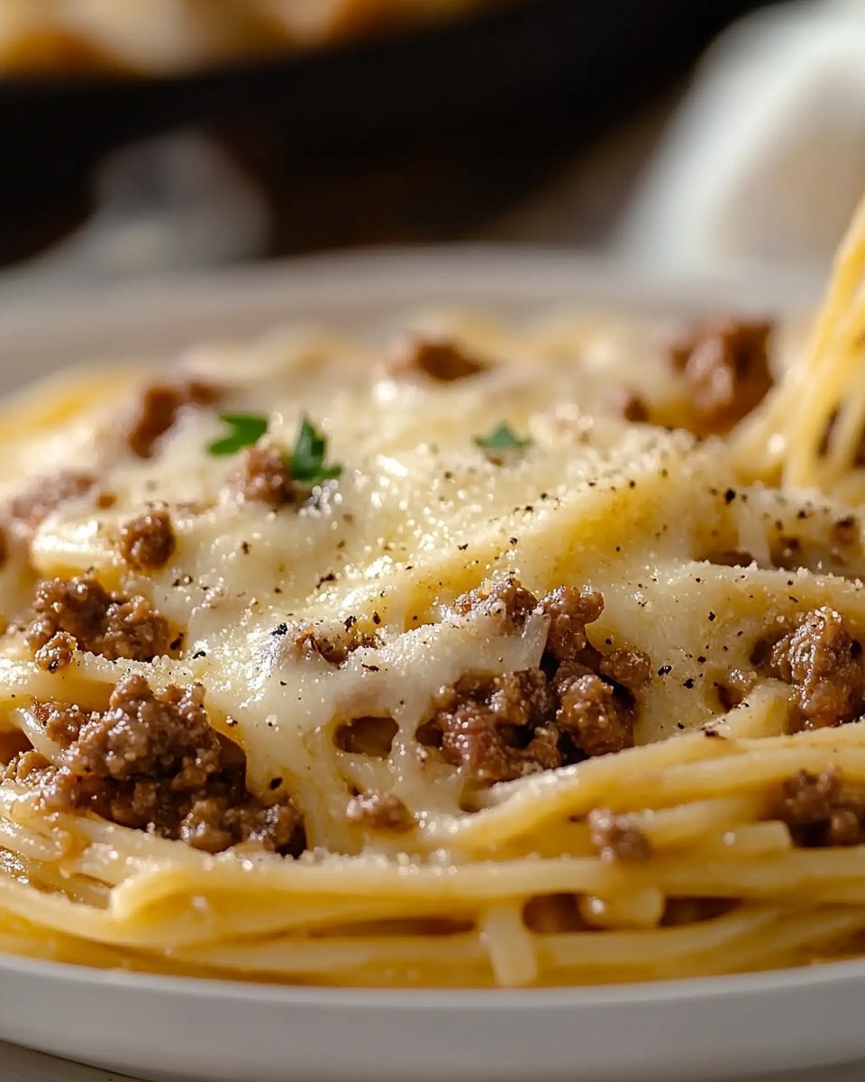 Создано на основе запроса: | Title: Cheesy Garlic Butter Linguine Pasta with Savory Ground Beef | Close-up Shot right view, taken by a