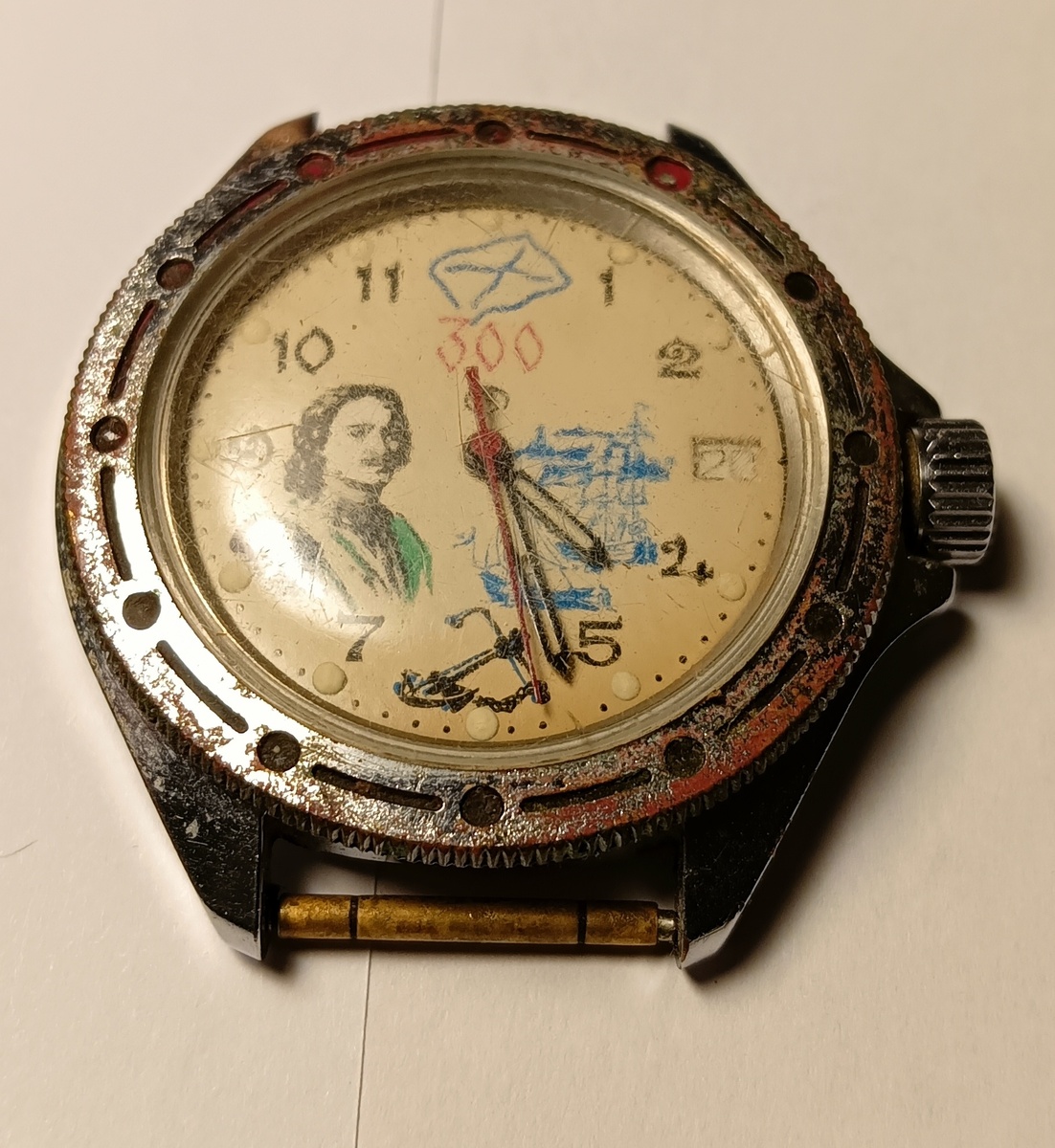 Доброго времени суток! Интересные часы - Восток Командирские с оригинальным циферблатом. Состояние корпуса плачевное. Техзадание от подписчика - заменить корпус и сделать репассаж. Корпус также был доставлен почтой. Приступаю! Открыл крышку, часы на ходу, но репассаж им нужен. Ходят не очень уверенно. Снимаю стрелки. Циферблат в хорошем состоянии. Снимаю циферблат. Разбираю механизм. Далее его ожидает чистка, сборка и смазка. Механизм собрал - ход отличный. Не забываю смазывать камни баланса. Кстати интересно что на циферблате с обратной стороны выбита звезда. На обычный циферблат Командирских нанесли рисунок с Петром 1. Попытался отмыть циферблат от желтизны, немного побелее стал, но видимо уже сама краска пожелтела от времени. Новый корпус- полный комплект с ЗГ и всеми кольцами о прокладками. Установил механизм, конечно в новом корпусе и часы смотрятся как новые. Регулирую точность с помощью таймграфера - незаменимый прибор. Вверх циферблатом - норма. На боку вообще чётко в 0 ,не оч