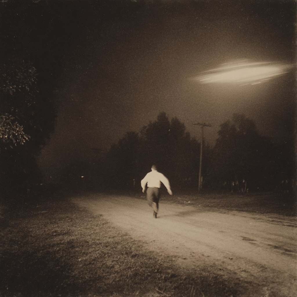 Создано на основе запроса: a photograph of a man running away from a UFO / American south state Louisiana / nighttime / 1930s / sepia tone