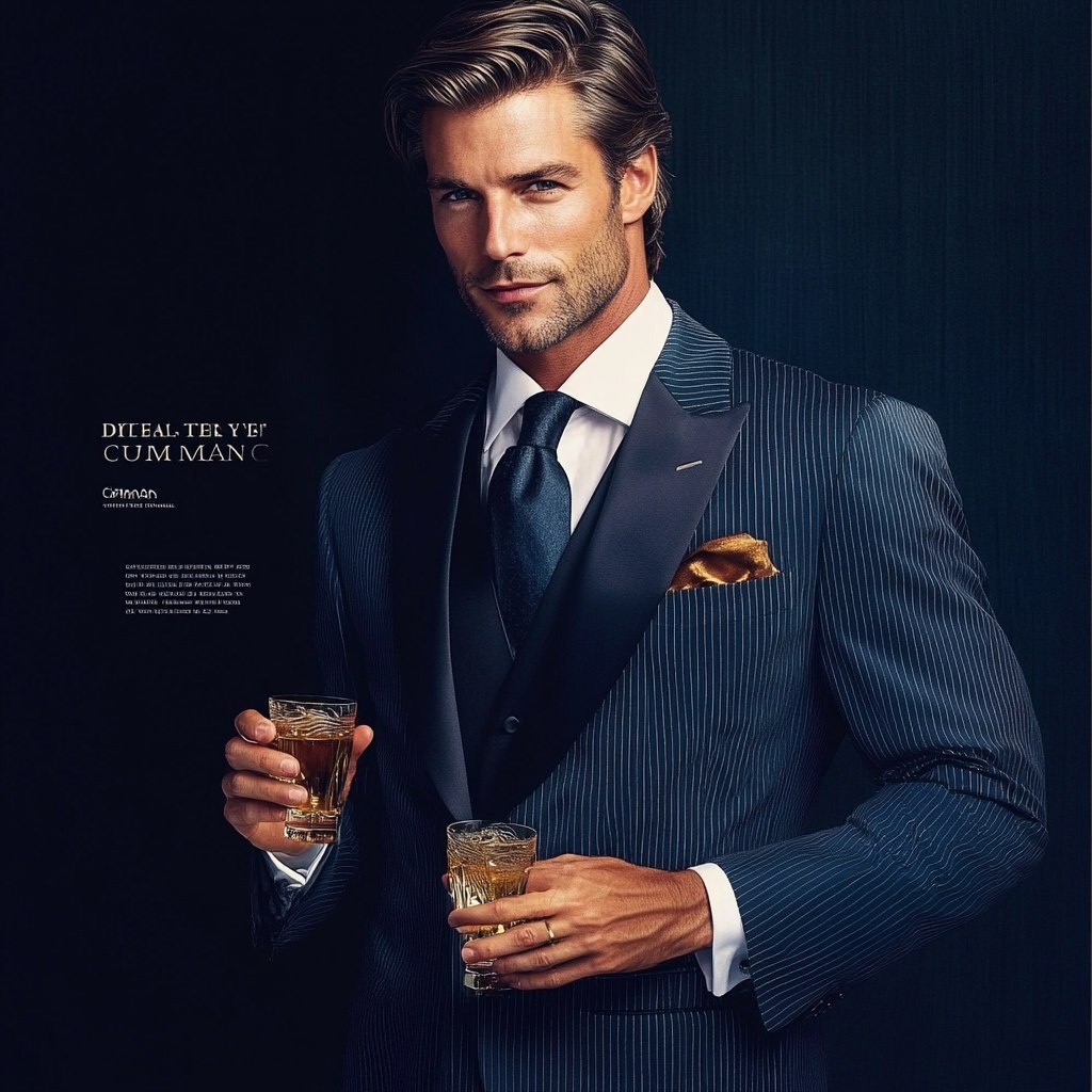 Создано на основе запроса: a elegant man wearing a suit holding a drink, stand up, fashion campaing