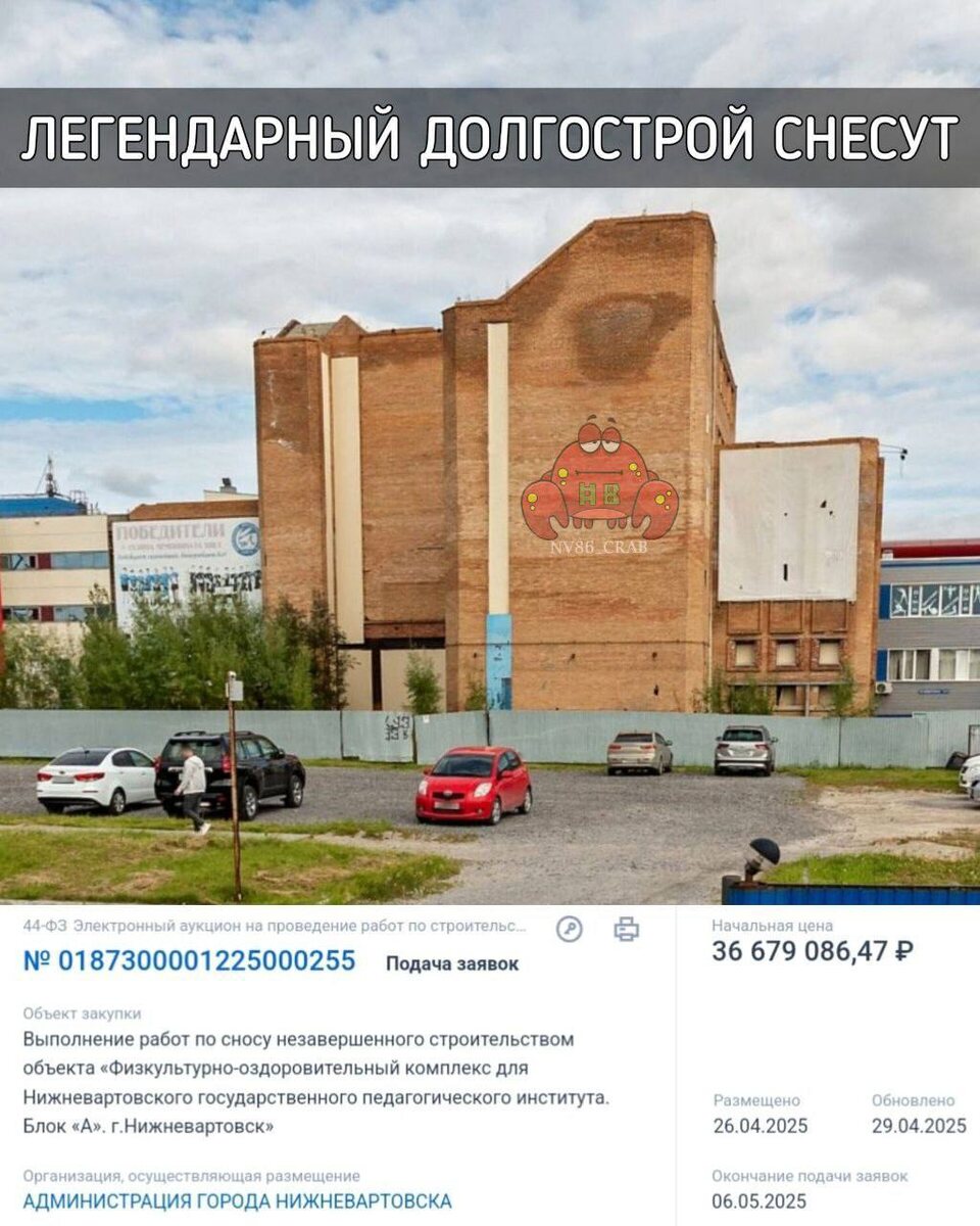 🏗 Прощай, заброшка: недостроенное здание у спорткомплекса НВГУ снесут В Нижневартовске наконец-то уберут легендарный долгострой у спорткомплекса «Нефтяник». Годы простоя сделали свое дело: конструкция обветшала, начала разрушаться и признана потенциально опасной. Тендер на снос здания уже разместила администрация города. Подрядчик должен будет полностью демонтировать объект до 30 ноября 2025 года. Стоимость работ — 36,6 млн рублей. Напомним, здание начали возводить еще в 90-х — по неподтвержденным данным, под нужды банка «Капитал». В середине 2000-х оно использовалось как рекламный щит, позже стало полноценной заброшкой. История участка до сих пор вызывает вопросы. По данным НВГУ, в 1995 году занятия велись в спорткомплексе, а рядом стоящее современное здание факультета еще не было достроено. 📷: Типичный краб Нижневартовск Подписаться | Прислать новость | Дать «буст»