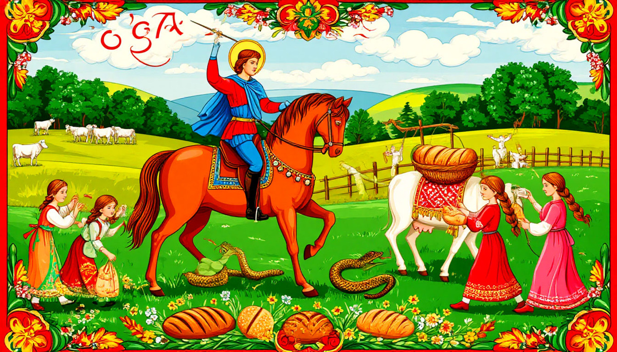 "На Юрия роса – не надо коням овса" 1. Выгон скота Главный ритуал дня – первый выгон скота в поле. Пастухи совершали обряды для защиты животных: · Окуривали стадо целебными травами. · Били ветками вербы – чтобы скот был здоровым. · Пекли обрядовое печенье в форме лошадей и коров. 2. Освящение полей Крестьяне выходили в поле, священники освящали посевы, а молодежь водила хороводы. 3. Запреты на Юрия ❌ Нельзя прясть и шить – "а то волки овец перегрызут".