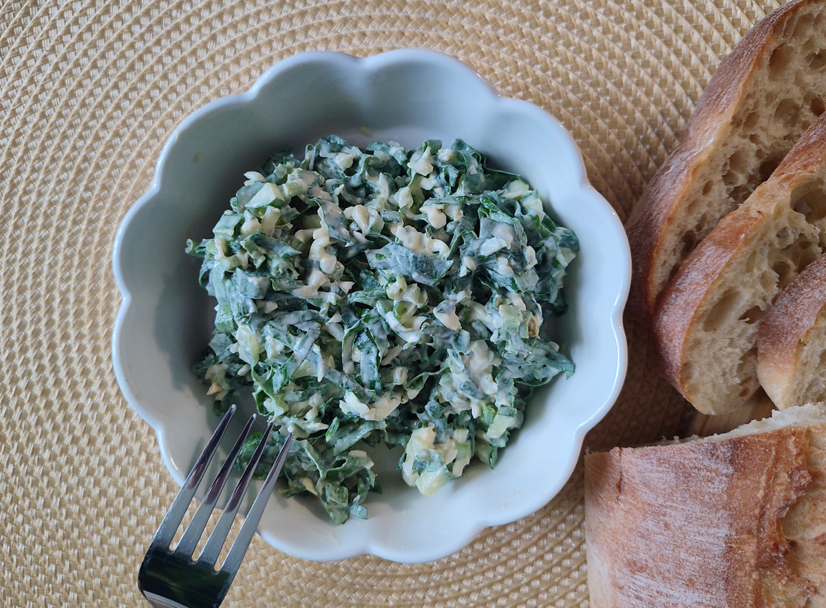 Салат с черемшой, отварными яйцами, огурцами и сметаной.