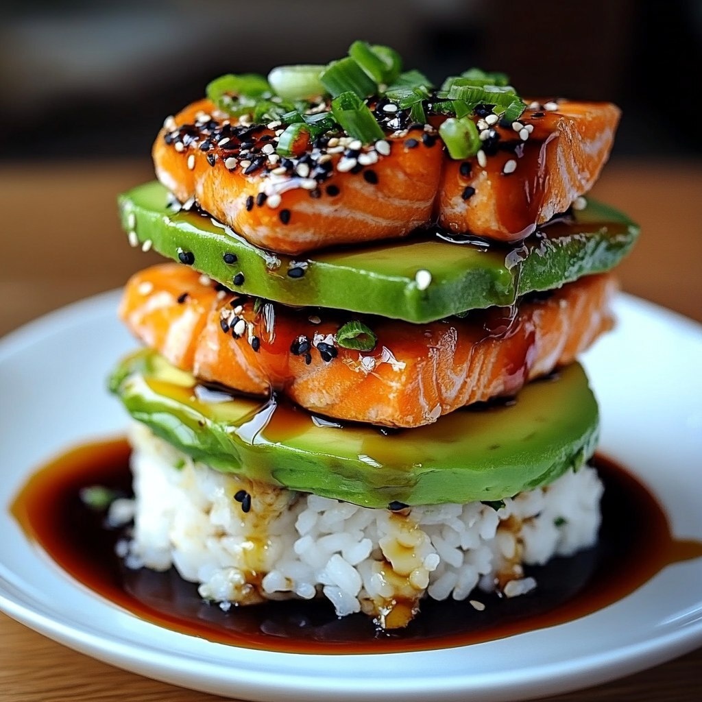 Создано на основе запроса: | Title: Teriyaki Salmon Avocado Rice Stack