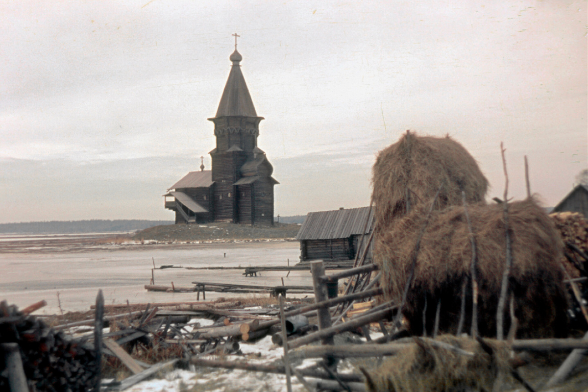 Это один из моих любимых слайдов на тему русской архитектуры, из тех, что есть у меня. На нём мы видим церковь Успения Пресвятой Богородицы в карельской Кондопоге, построенную в 1774-м году и утраченную в 2018-м году. Церковь сумела пережить революцию, богоборчество и финскую оккупацию, но была сожжена невменяемым подростком. Этот снимок интересен ощущением исторической инерции. Если бы я ничего не знал о времени и обстоятельствах съёмки, мне было бы сложно понять, когда сделана эта фотография. При Хрущёве, Брежневе, Горбачёве, Ельцине, Путине? А может это декорации к фильму про правление Николая II или даже Николая I? Определённо, некоторые уголки нашей Родины отличаются удивительной неторопливостью бытовых изменений.