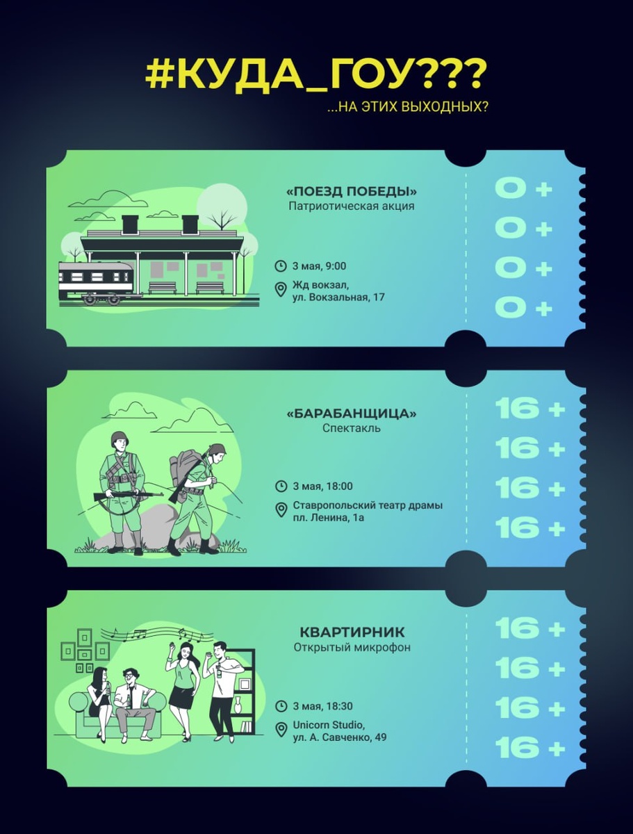 Как в течение долгих выходных отдохнуть не только на природе? Ответы найдутся в «куда гоу»! 🔹Поезд Победы 3 мая в Ставрополь прибудет поезд Победы. Состав из восьми тематических вагонов прибудет на железнодорожный вокзал Ставрополя и будет ждать всех желающих присоединиться к патриотической акции с 9 до 13 часов. Кроме того на мероприятии выступят творческие коллективы города. 0+ 🔹Барабанщица В Ставропольском театре драмы им. М. Ю. Лермонтова 3 мая состоится спектакль «Барабанщица». Показ начнется в 18:00, мероприятие доступно к посещению по Пушкинской карте. 16+ 🔹Квартирник Любителей музыки 3 мая будут ждать в студии искусств Unicorn, где в 18:30 состоится атмосферный квартирник. Мероприятие пройдет в формате открытого микрофона, поэтому каждый желающий сможет не только насладиться чужим творчеством, но и поделиться своим. 16+ 🔹Назад в 80-ые! В ресторане Баклажан 3 мая в 20:00 начнется дискотека в стиле 80-х. Диджей, танцы, фотозона создадут атмосферный вечер, поэтому не стоит заб