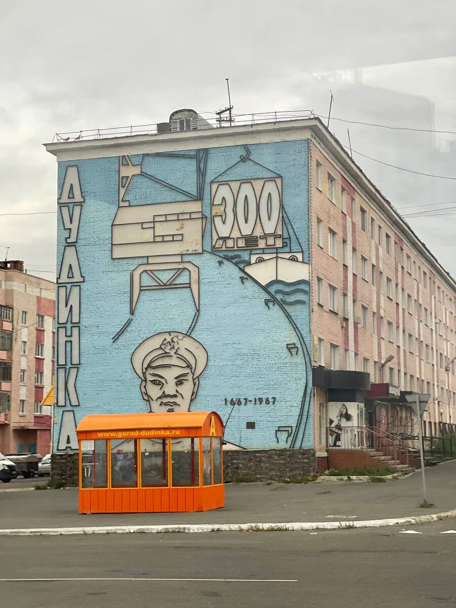 Композиции советского времени на брандмауэре жилых домов в заполярном городе Дудинка, в Красноярском крае на берегу стремительного Енисея.