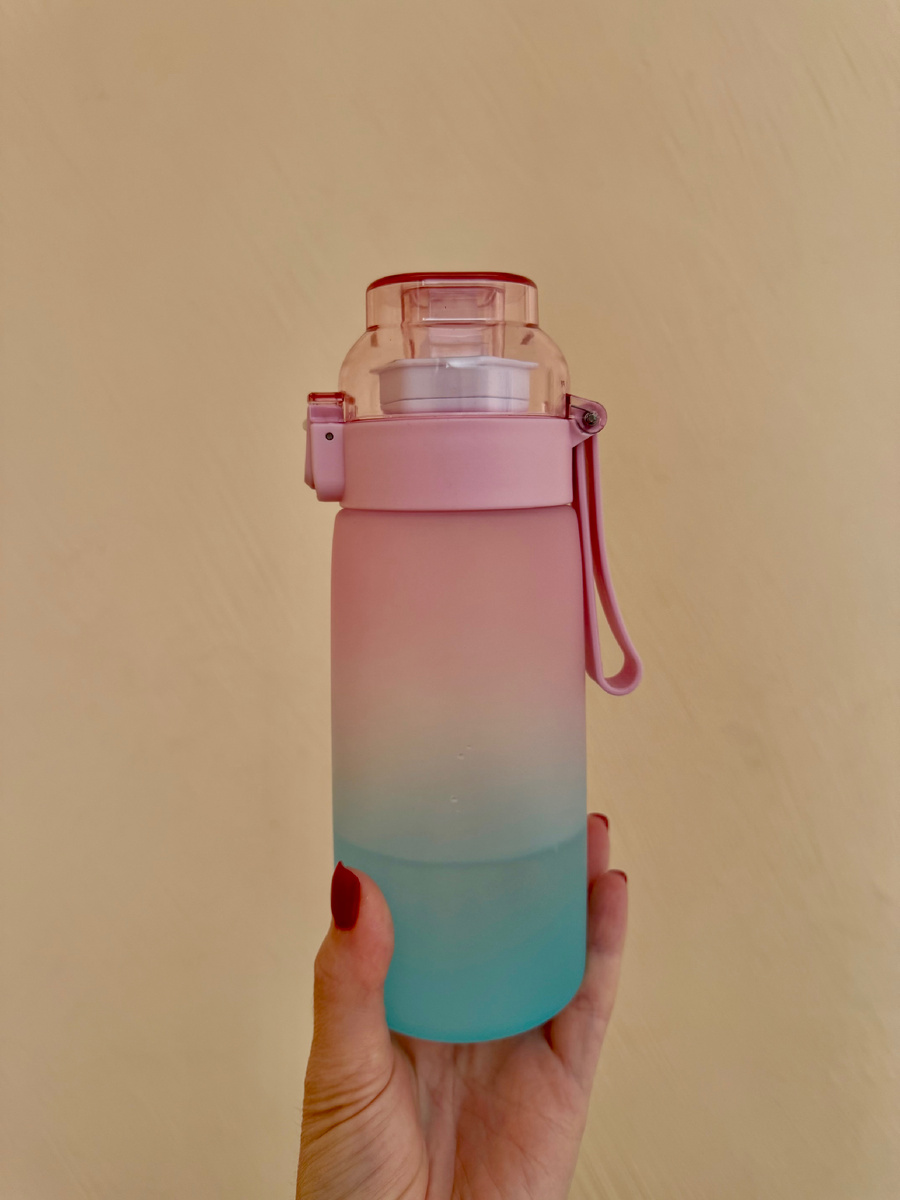 Я купилась на тренд с бутылкой для воды с насадками разных вкусов и купила попробовать. Сейчас расскажу о своих впечатлениях. На маркетплейсах большой выбор подобных бутылок, принцип действия которых одинаковый. Моя бутылка обошлась в 1600 рублей (есть дешевле и дороже). Сама бутылка из приятного матового пластика. Цвет красивый розово-голубой. Объем 600 мл. В комплекте инструкция и 3 картриджа (вишня, молоко и без аромата). Сначала я, конечно же, решила не читать инструкцию и сразу попробовать вставить картридж, но вкуса не оказалось никакого. Я уже расстроилась, думала мне досталась бракованная бутылка и я просто так ее купила, но решила все же почитать, что пишут в инструкции. Для активации аромата насадка на наконечник должна быть приподнята до уровня, для деактивации опущена до конца вниз. И также нужно попасть насадкой параллельно точкам на самой бутылке. И случилось чудо - я почувствовала как вкус воды поменялся. Конечно, мозг не обманешь и понимаешь, что пьешь воду, но ар
