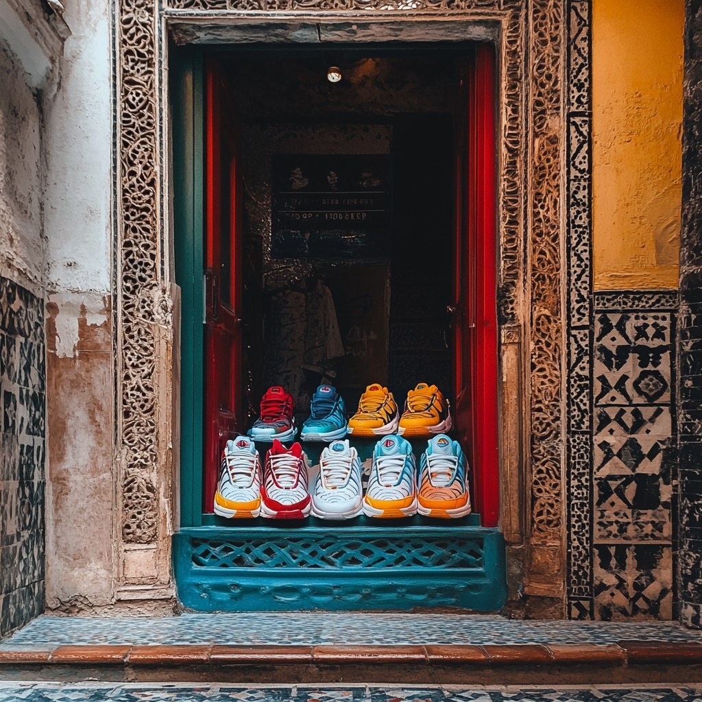 Создано на основе запроса: a reallife foto of morrocan housing seeing a front door with a bunch of Nike airmax plus shoes on it (Nike tuned