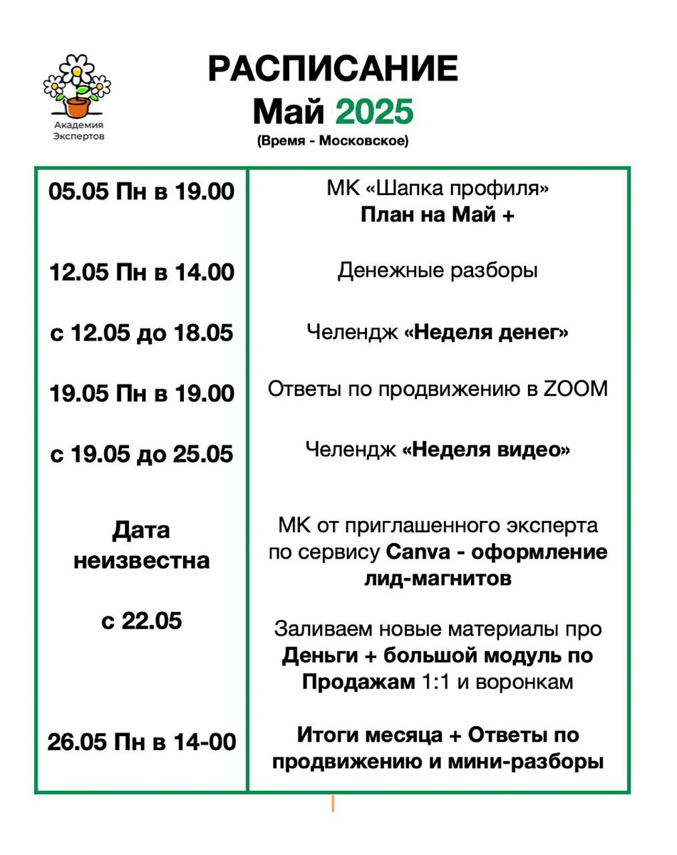 Расписание Академии Экспертов на МАЙ 2025 года 🔹Девиз месяца - деньги и продажи. Начнем с шапки профиля - проверим, как и у кого оформлено. Хотят ли подписчики оставаться у вас в соцсетях. Проведем денежные разборы участников, поднимем установки, которые ограничивают и устроим челендж по деньгам. Плюс недельный челендж по видео. И в мае зальем новый большой модуль про деньги + НОВЫЙ модуль по продажам. Пусть Май будет супер-денежным и удачным для всех нас! 🔥 Если вы еще не в Академии 👇👇👇 https://riverpsy.com/academyclub https://riverpsy.com/academyclub https://riverpsy.com/academyclub Всем ромашек! 🌸🌸🌸