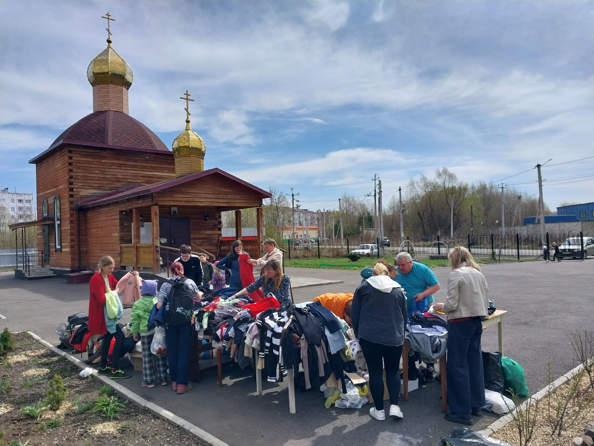 27 апреля 2025 года на территории храма преподобного Сергия Радонежского г. Осинники прошла благотворительная ярмарка раздачи вещей для семей города.
