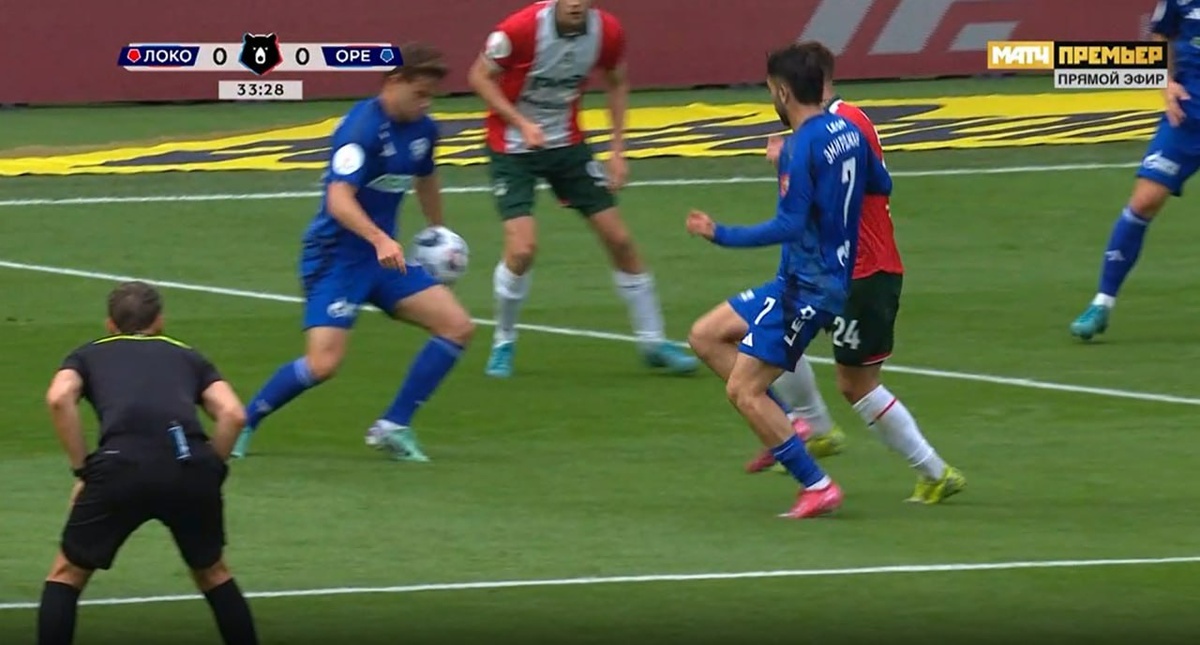 Локомотив-Оренбург 34 мин. Правильное решение принимает Казарцев и продолжает игру. Рука игрока команды Оренбург находится в естественном положении в которую попадает мяч. Правильное решение; Продолжить игру