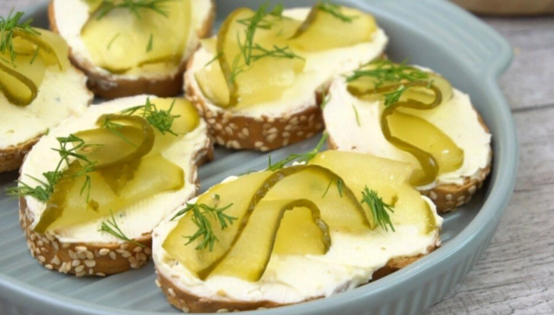 Или можно приготовить очень вкусные бутерброды. Багет нарезаем, подсушиваем в духовке или обжариваем на сковороде гриль, на небольшом количестве растительного масла. Смазываем хлеб маслом сверху кладем огурчики и украшаем зеленым луком или укропом. Бутерброды готовы.