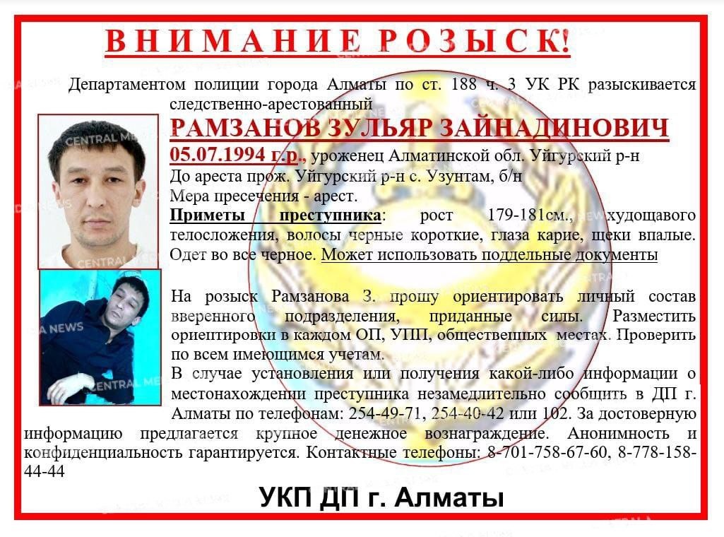 ⚡️Мужчина сбежал из следственного изолятора Алматы - его ищет полиция Ориентировка на некоего Рамзанова, который сбежал, предположительно, из следственного изолятора Алматы, разлетелась по социальным сетям. Видео, где мужчина якобы выпрыгивает из окна здания используется как доказательство. Согласно данным ориентировки, мужчина был задержан за кражу в крупном размере. Он высокий, худощавого телосложения, может использовать поддельные документы. На розыск Рамзанова З прошу ориентировать личный состав вверенного подразделения. (...) В случае установления или получения какой-либо информации о местонахождении преступника, сообщить в ДП г. Алматы", - говорится в ориентировке. Фото/Видео: CMN/KZ ✍️Подписывайтесь на t.me/CentralMediaNews