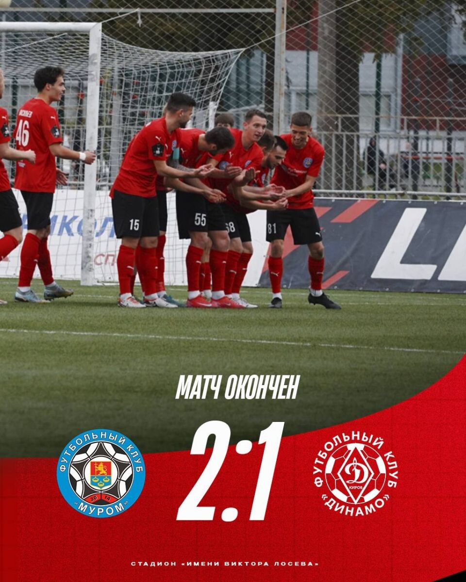 На стадионе имени Виктора Лосева завершился матч 11-го тура Второй лиги, дивизион А, между футбольными клубами “Муром” и “Динамо Киров”. Игра завершилась победой хозяев поля со счетом 2:1.