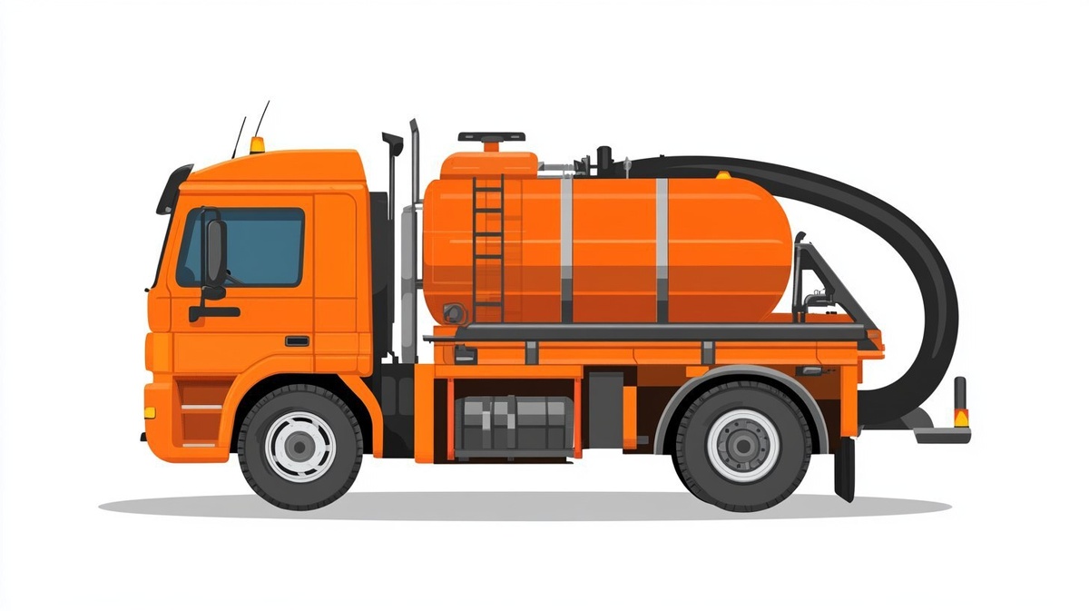 Создано на основе запроса: flat vector icon of vacuum truck (septic tank truck), side view, clean geometric shapes, solid colors, no text or