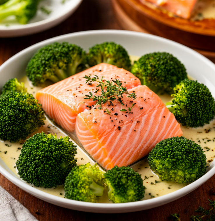Приготовим нежную и сочную горбушу с брокколи, запеченную в сливочном соусе! Возьмем 1 кг горбуши, разморозим, если необходимо, промоем и нарежем на порционные куски. 300 г брокколи разберем на соцветия. Форму для запекания смажем оливковым маслом. Выложим в форму куски горбуши. Сверху разложим соцветия брокколи. В отдельной миске смешаем 250 мл сливок 10%, 1/6 ч. л. тимьяна, соль и черный молотый перец по вкусу. Тщательно перемешаем сливочную заливку. Равномерно зальем горбушу и брокколи сливочным соусом. Разогреем духовку до 180 градусов. Поставим форму с горбушей и брокколи в разогретую духовку на 30-35 минут. Запекаем до готовности рыбы и мягкости брокколи. Достанем блюдо из духовки и дадим немного остыть. Подаем горбушу с брокколи, запеченную в сливках, горячей. Это блюдо идеально подходит для легкого и полезного ужина! Наслаждайтесь нежным вкусом рыбы и сливочным соусом!