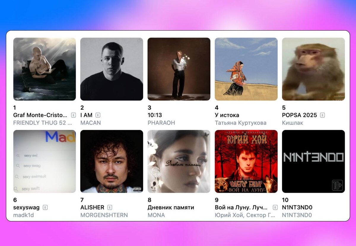 👑 🎵 Альбом FRIENDLY THUG 52 NGG «Graf Monte-Cristo / Most Valuable Pirate» уже вторую неделю удерживает 1 место чартов в VK Музыка Кишлак с новым альбом «POPSA 2025» — уже на пятой строчке, и собрал больше 250 тыс. прослушиваний на официальном плейлисте. Также в чарте неожиданно оказался новый релиз LIL KRYSTALLL «17». Чарт засчитал его как альбом — и новая музыка Уланса пока что только на 89 месте. @mainstreamusic