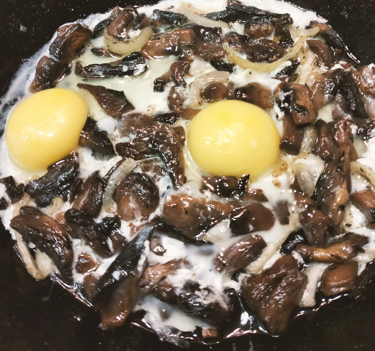 Это блюдо можно приготовить с разными грибами. У меня, чаще всего, получается его делать с шампиньонами. Почистить, промыть и нарезать соломкой грибы. ( Если вы делаете с лесными грибами, то их предварительно нужно отварить). Разогреть сковороду с небольшим количеством подсолнечного масла, засыпать грибы. Обжаривать их, пока на грибах не начнет появляться золотистая корочка. Посолить и поперчить грибы. Затем добавить, нарезанный соломкой, репчатый лук. Перемешать и накрыть крышкой. Грибы с луком обжарить в течении 2-3 минут. Когда лук станет "прозрачным", добавляем яйца. При желании, можно отдельно в ёмкости яйца взбить, тогда блюдо получится как омлет. На приготовление займет времени не больше 10 минут. Очень быстро, очень вкусно и очень питательно. Приятного аппетита!