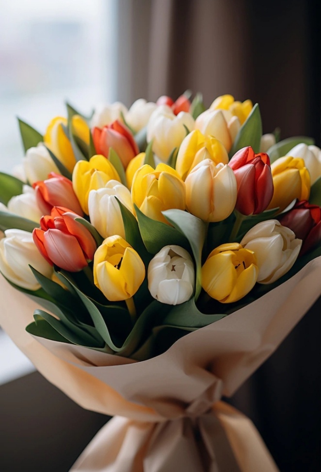 На углу дома его подхватил порыв ветра, как будто кто-то внезапно включил турбину прямо в лицо. Пленку с букета вывернуло наружу, и один тюльпан — тот самый желтый — вылетел, как парашютист без парашюта.