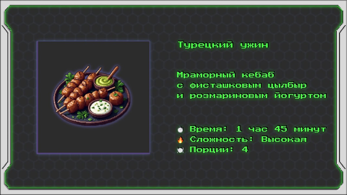 Турецкий ужин Мраморный кебаб с фисташковым цылбыр и розмариновым йогуртом Этот рецепт представляет собой современную интерпретацию традиционного турецкого кебаба, где говядина и баранина сплетаются в мраморный узор, а подают его с инновационными соусами на основе местных ингредиентов. Информация о рецепте: ⏱️ Время: 1 час 45 минут 🔥 Сложность: Высокая 🍽 Порции: 4 Ингредиенты: Для кебаба: • 🥩 Говяжий фарш — 250 г • 🐑 Бараний фарш — 250 г • 🧄 Чеснок (измельчённый) — 3 зубчика • 🌶 Паприка сладкая — 1 чайная ложка • 🌶 Перец чили молотый — ½ чайной ложки • 🧂 Соль — по вкусу • 🌶 Молотый чёрный перец — по вкусу Для фисташкового цылбыра: • 🥚 Яйца — 4 штуки • 🌰 Фисташки (очищенные) — 50 г • 🫒 Оливковое масло — 3 столовые ложки • 🧂 Соль — по вкусу • 🍋 Лимонный сок — 1 чайная ложка • 🌿 Укроп свежий — для украшения Для розмаринового йогурта: • 🥛 Греческий йогурт — 200 г • 🌿 Розмарин свежий — 1 веточка • 🍋 Лимонный сок — 1 чайная ложка • 🧂 Соль — по вкусу Приготовлен