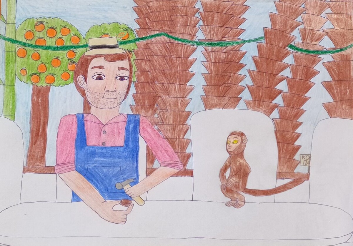 В ботаническом саду растёт много разных диковинных видов растений. На тропических плодовых деревьях висят бананы, финики, апельсины, манго, грейпфруты, папайи, маракуйи и авокадо. В кустарниках созрели ананасы. Грецкие орехи давно на ветвях созрели внутри каждой зелёной кожуры. Здесь порой встречается животный мир: летают стрекозы, бабочки и пчёлы для впечатления красотой ботанических чудес и собирания пыльцы и нектара из тычинок цветков. Вокруг сада чирикают соловьи и попугаи. Гламурные павлины ходят мимо деревьев, и у них хвосты расфуфырились веерами. По лианам среди кокосовых пальм скачет весёлая длиннохвостая макака. Около пальм стоит белый деревянный столик с одной крепкой ножкой посередине. Вокруг него расположены пластмассовые стулья точно такого же белого цвета, как у столика. А на нём лежит выпавший с дерева грецкий орех. Макака спрыгнула с лианы на стол и присаживалась напротив ореха. Она сейчас очень голодна. Её другие товарищи тоже проголодались. У кольцехвостого лемура,