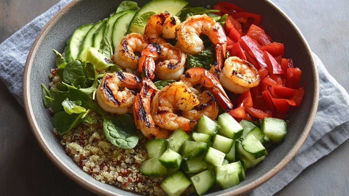 Создано на основе запроса: A vibrant and healthy quinoa bowl featuring grilled shrimp, topped with fresh avocado cubes, cucumber, red bell
